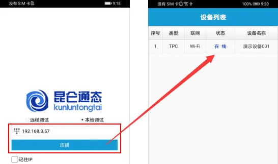 如下图,手机端运行MCGS调试助手,选择“本地调试”,输入触摸屏WiFi网卡IP地址后,点击“连接”,显示设备列表。