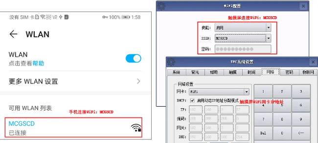 手机和触摸屏通过WiFi连接到同一个路由器,如下图所示,手机和触摸屏均连接同一个WiFi,触摸屏WiFi网卡IP地址为:192.168.3.57。