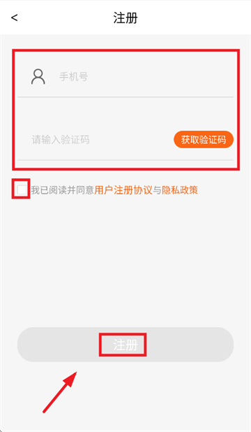 输入手机号,验证码,勾选我已阅读并同意用户注册协议与隐私政策,点击注册即可