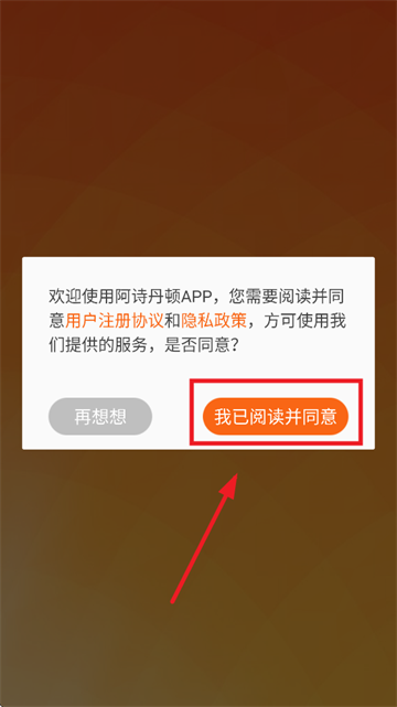 下载安装并打开阿诗丹顿APP,先点击我已阅读并同意