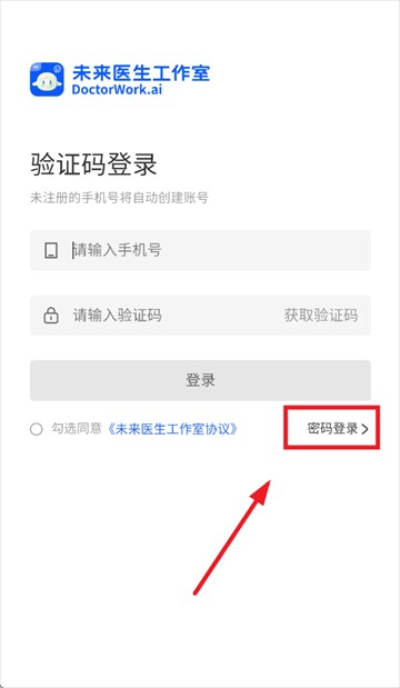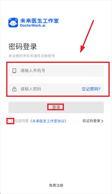 输入手机号,密码,勾选同意 《未来医生工作室协议》,点击登录即可