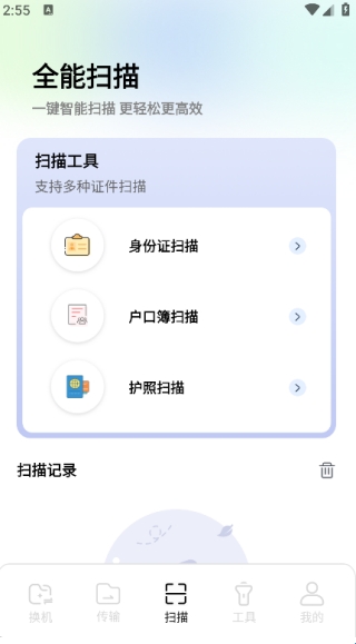 点击页面下方的‘扫描’,即可扫描多种证件,查看扫描记录。