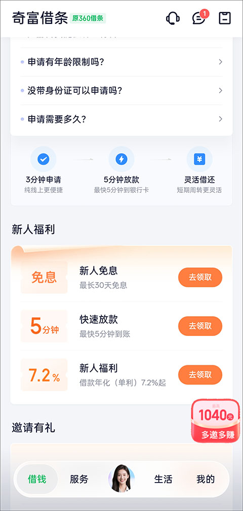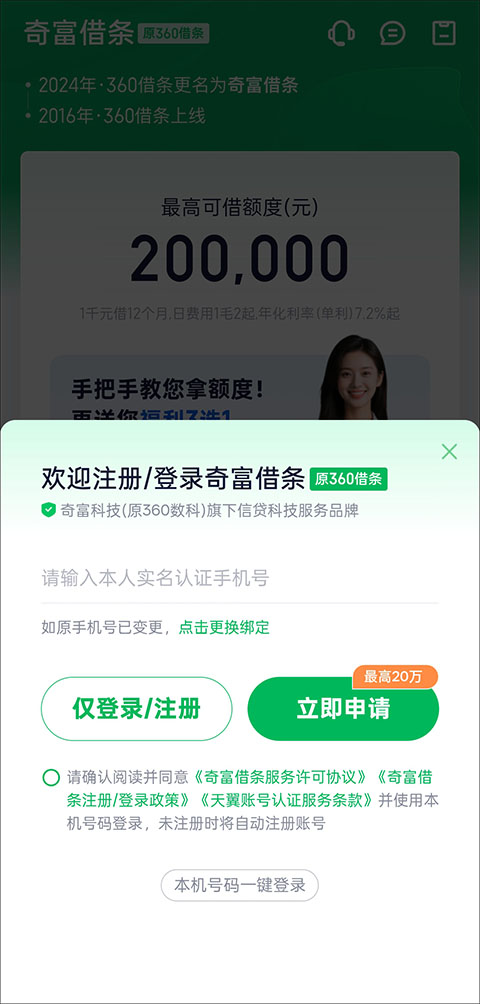 360借条app官方版是由奇富科技(原360金融)自主研发并运营的持牌消费金融平台客户端,依托上市公司背景与国家认证的金融科技能力,为用户提供全流程线上化、纯信用、无抵押担保的合规信贷服务。申请门槛低、审批效率高、资金到账快、综合息费透明,覆盖日常周转、应急备用、消费分期等多元资金需求,已累计服务超1.63亿注册用户。
