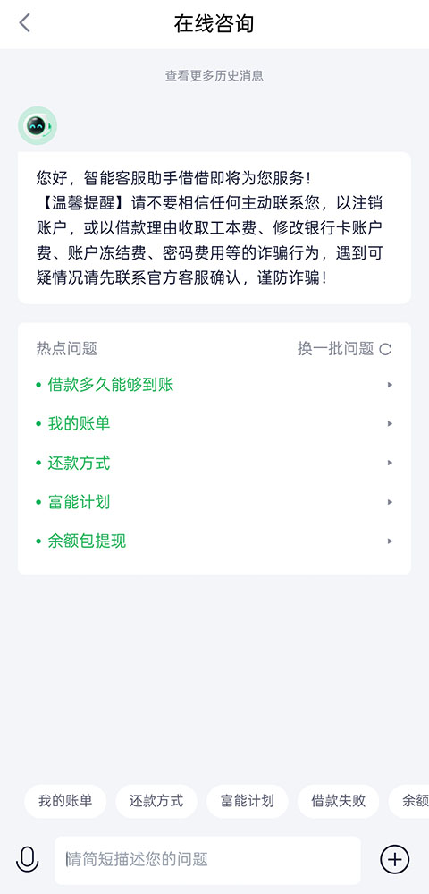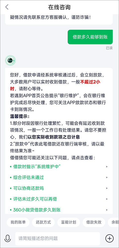 3、在对话框中输入具体问题,如“借款多久到账”“如何修改还款银行卡”等,系统即时响应。