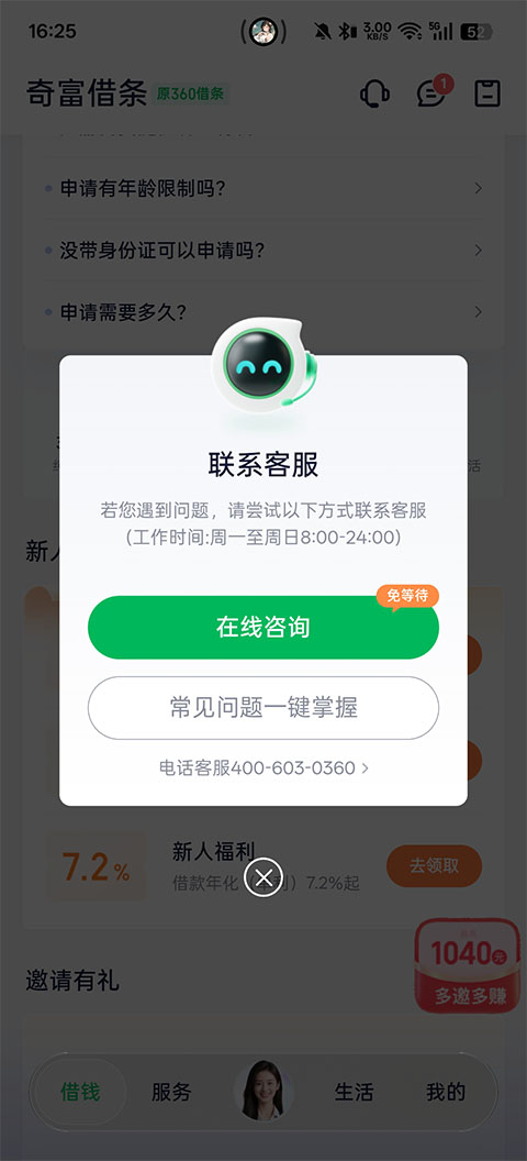 1、在借款页面右上角点击【耳麦图标】,快速进入客户服务通道。
