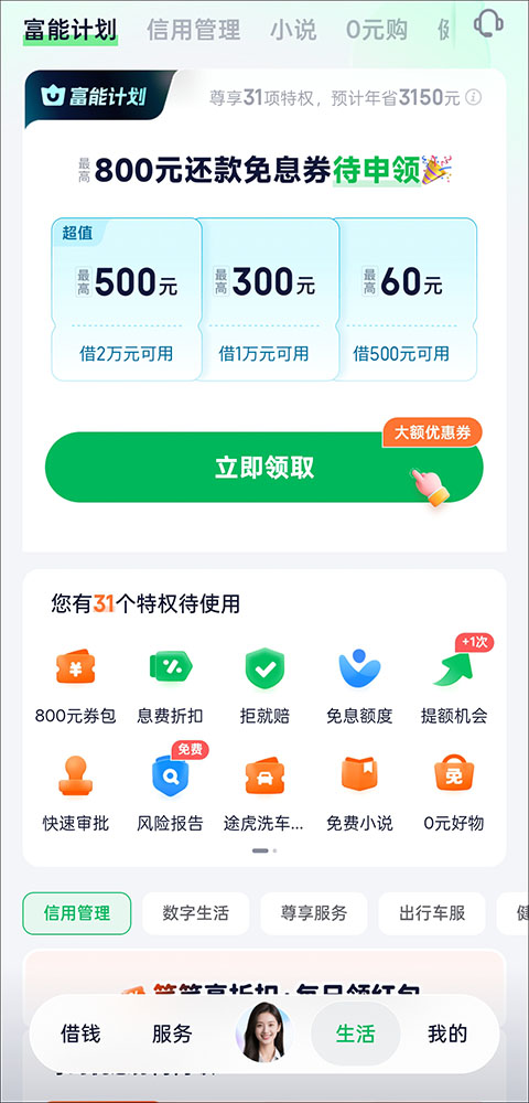 3、切换至【生活】频道,可领取新用户专属免息券,提升实际可用额度。