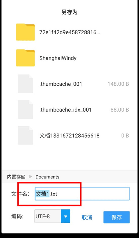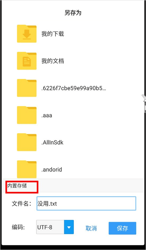 4、点击文件名上方的“内置存储”,选择我们要保存的文件夹,然后点击右下角的保存即可将文件保存到手机里。