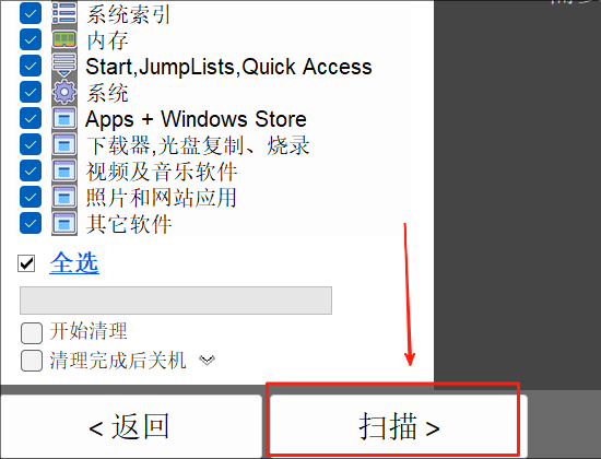 - 勾选需清理的文件类型,点击【扫描】按钮开始分析;