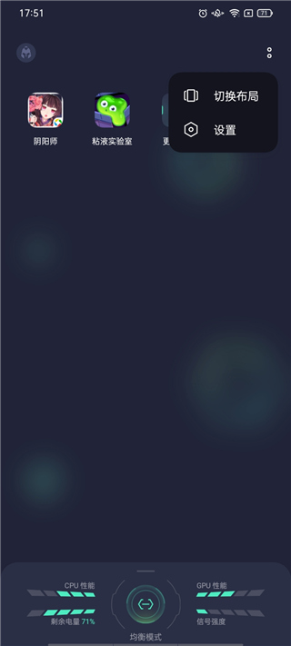 5、点击右上角可切换界面布局或进入设置,底部实时显示CPU/GPU负载、信号强度等关键性能数据,