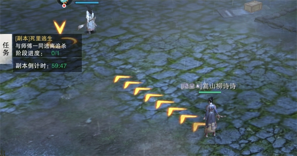 3、进入游戏后,接到新任务,副本死里逃生,和师傅一起逃离追杀,手指控制角色跟随师傅。