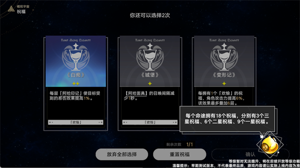 2、独创祝福系统:每局游戏可自主选择祝福,涵盖攻击强化、资源增益、机制突破等多元方向;命途下共设18个祝福——3个三星、6个二星、9个一星,策略搭配决定战力上限。