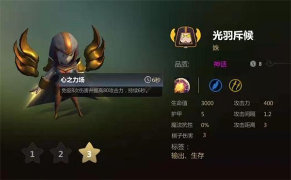 光羽斥候是光羽和刺客阵容里的核心棋子,作为刺客,她可以享受最少15%的3倍暴击效果,而作为光羽族,又能享受到最低20%的闪避几率,并且自身攻击和血量都不弱,最关键的是她的“心之力场”技能,免疫4次伤害的同时还能提高40点攻击力,变相提高了她的生存能力,如果升到3级,这个免疫效果将提升到8次,搭配回蓝装,只要不是被围殴,她基本上是处于“无敌”状态的。