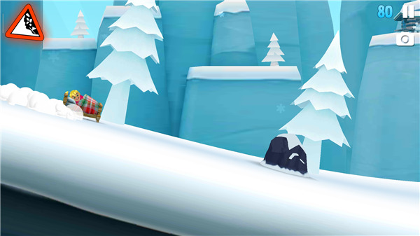 5、接着进入游戏便可开始,需要在雪崩来临之前快速前进,屏幕左侧上方的雪崩警示牌会在雪堆即将接近时不断地闪烁以示警告,即时你已经在视野中能够看到背后奔腾而来的大雪,如果此时爬起继续滑行,那么甩掉这近在咫尺的雪堆也并非不可能;