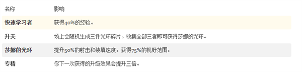 作为初始角色,莎娜的能力是重掷升级选项,极大降低随机性干扰,近乎自主定制流派。其专属升级包含经验获取提升与“下一次升级效果×3”等强力增益。若集齐三件光环装备,还可显著提升射速、换弹速度与视野范围,综合潜力不容小觑。