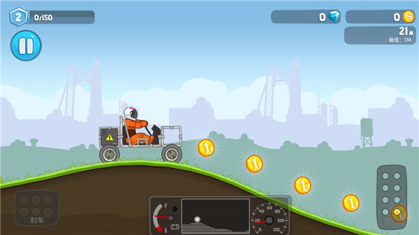 3、改装完成后即可出发!左侧按钮控制刹车,右侧控制油门。当前轮腾空时轻点刹车稳住车身,后轮离地则适当加速保持平衡——目标是在能量耗尽前成功冲线,操作简单却极具策略性;