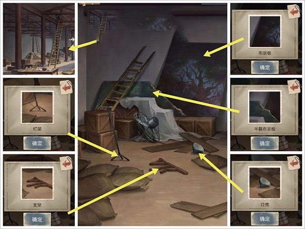 ⑵布景板倒了→相关线索→【半截布景板】、【支架】、【布景板】