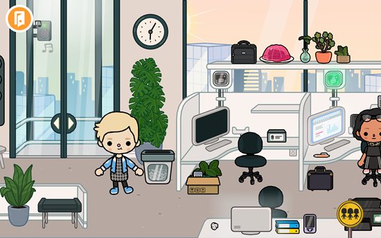 点击任意建筑即可进入内部。以商业大楼为例,进入后会看到一间布置齐全的办公室,桌上有电脑、文件夹等办公用品,还有正在工作的员工。