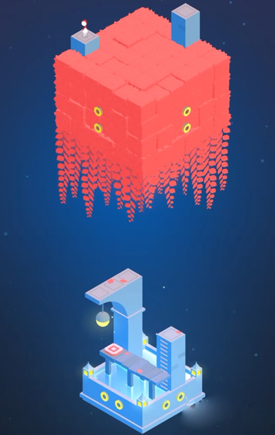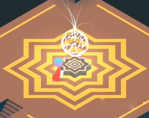 新场景中可直接点击发光小人完成互动。随后移动黄色建筑,使小人站上其上方的棕色方块,调整横截面后按下黄色按钮,最后再移动一次建筑,引导小人抵达图腾,本章圆满通关。