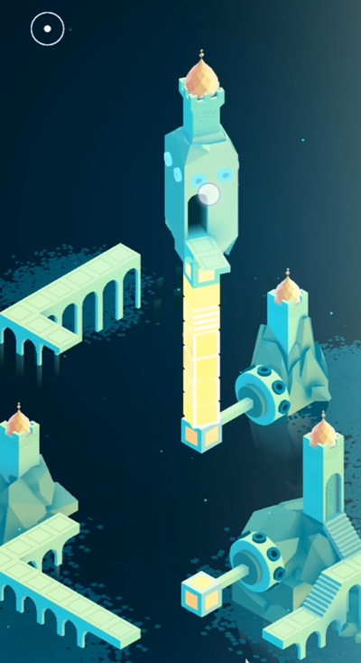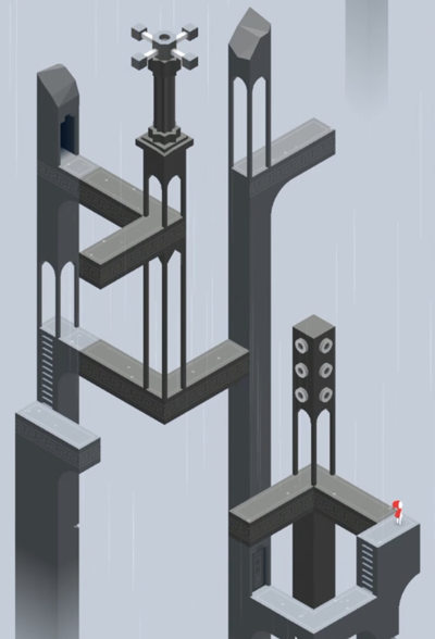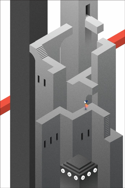 第二场景先登梯,再调整建筑连接成图示形态,随后旋转使其进入底层门内。第三场景需向上旋转结构,让小人经楼梯抵达发光体,返回第二场景后通过四次旋转打开顶层门扉。后续场景中,先将建筑调至图示状态,小人经传送门从中层门出现,再三次旋转搭建楼梯,最终进入终点门。第四场景中,利用可移动的凸弧墙依次触发两个灰色按钮,图腾显现,本章结束。