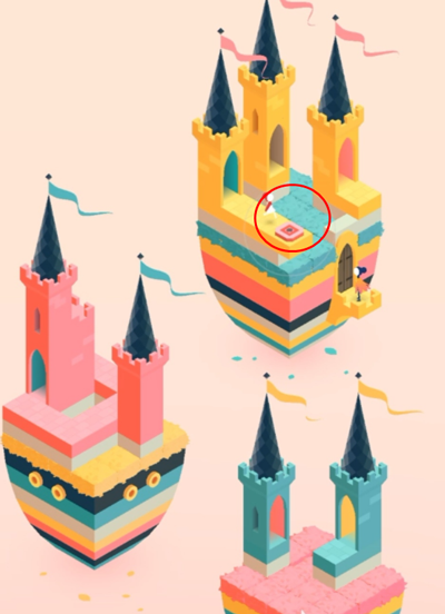 第三场景先将建筑移至图示位置供女儿站立,随后下移并旋转,使其通过梯子按下粉红按钮,结构升高;女儿登梯后再次旋转并上升建筑,顺利入门,萝尔也随之进入。第四场景需操控女儿依次按下蓝绿、粉红、黄色按钮,通过多次传送抵达最终门扉。第五场景需三次调整建筑形态,引导萝尔接近发光小人。最终场景中,先点按梯子下的蓝绿按钮,再触碰粉红按钮,即可走向图腾完成关卡。