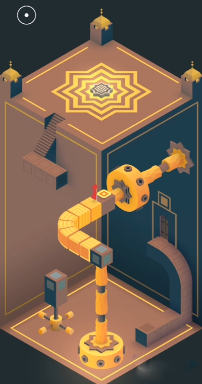 首场景通过旋转轴承构建楼梯(如图),引导小人登上并按下远处灰色按钮;重复操作两次,依次触发其余按钮,最终通往出口。