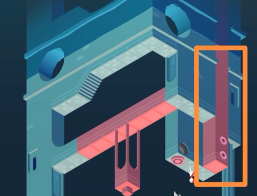 首先引导萝尔与女儿沿梯子攀至建筑顶端,两人分别按下两侧按钮,开启通路后进入新场景。第二场景仅萝尔一人,向右旋转建筑使其靠近发光小人,触发下一幕。第三场景需借助移动平台跨越断层:女儿先按近处粉红按钮升起结构,随后前往远处再按一次粉红按钮;此时萝尔进门,并按住浅黄圆形按钮,同时旋转圆柱,使女儿能抵达萝尔所在位置,最终两人一同进入终点门。