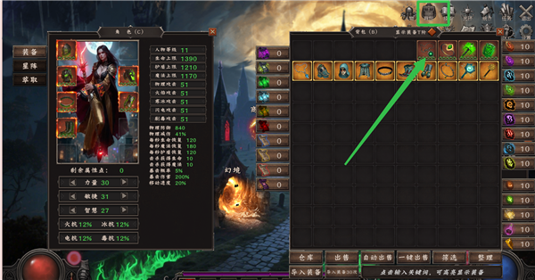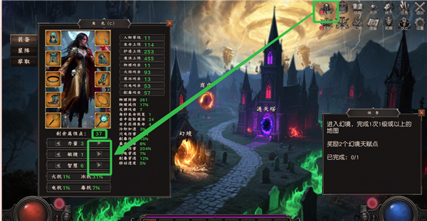 1、进入流放大陆,首先进行角色加点,点击【人物】进入面板,目前有37属性点,玩家可为力量、敏捷、智慧三属性加点。