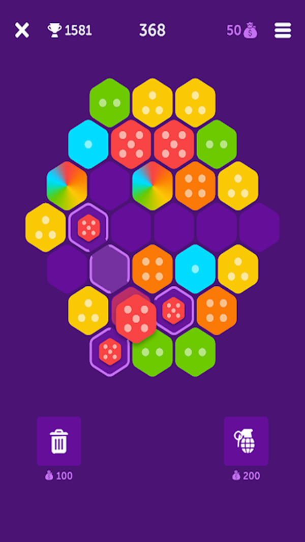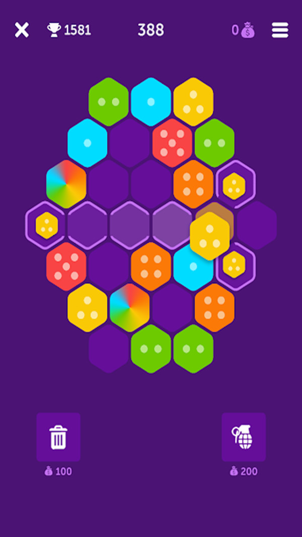只要积累金币就能兑换炸弹,借助它可以迅速清除大片区域的六边形。