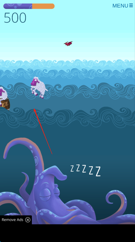 3、切换角色为绵羊,在海面跳跃红箭头,避开水下章鱼,持续推进,完成关卡挑战。