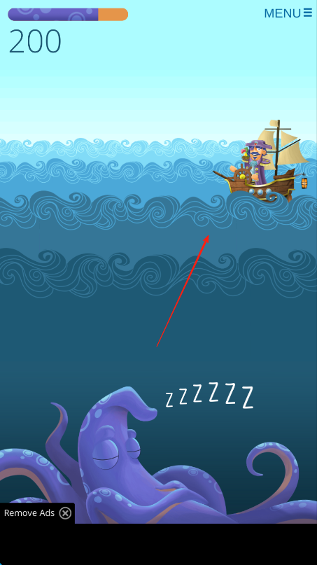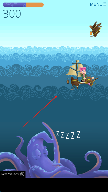 1、操控帆船红箭头,在海面行驶,避开沉睡的紫色章鱼,收集进度从200到300。