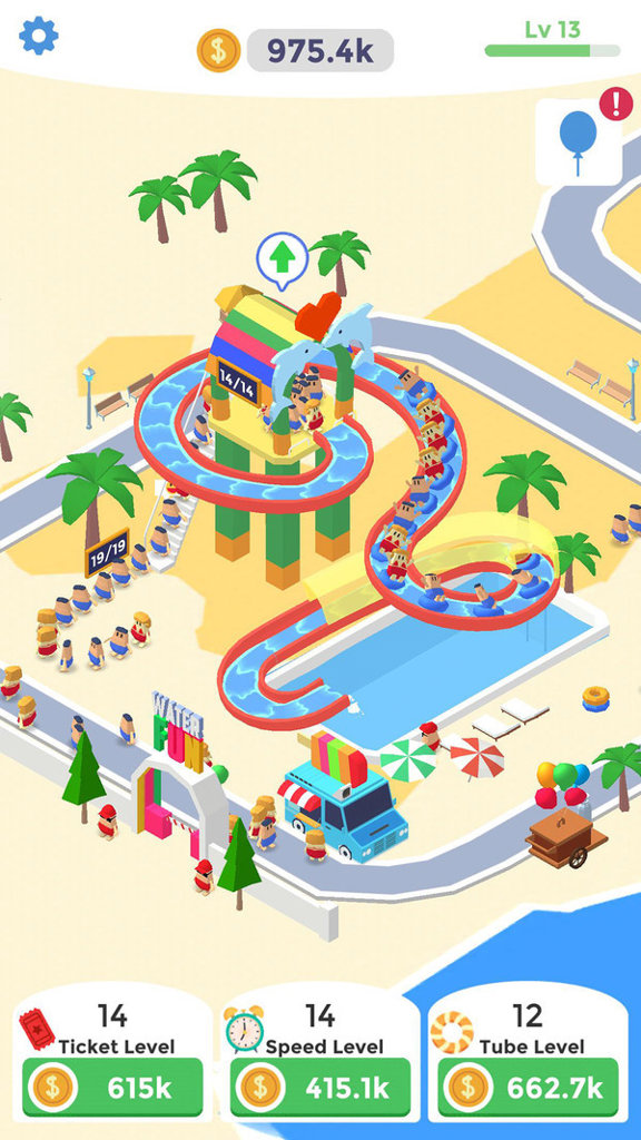 2. 玩家不仅能提升自身等级,还需持续升级各类水上娱乐设施,如滑水道、造浪池、漂流河等,以提高游客满意度与收益效率。