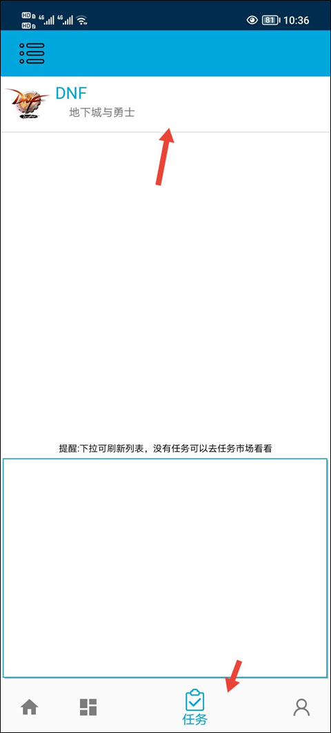 3. 登录成功后,进入“任务市场”,选择“DNF”专区。