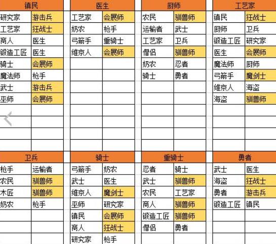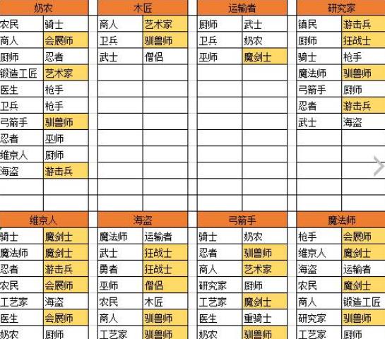 1、镇民、医生、厨师、工艺家、卫兵、骑士、重骑士、勇者父母职业搭配如下: