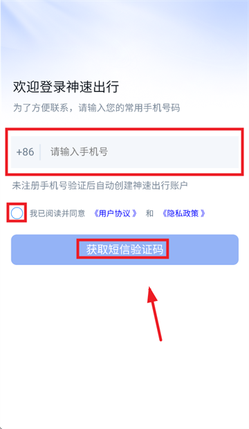 进入登录界面,输入手机号,勾选我已阅读并同意 《用户协议》 和 《隐私政策》,点击获取验证码登录即可,未注册手机号验证后自动创建神速出行账户