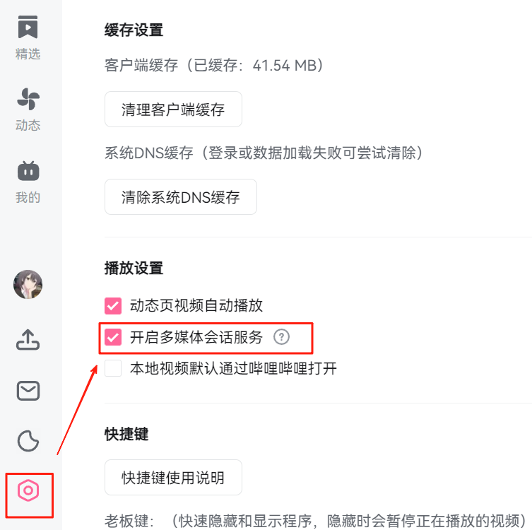 多媒体会话服务:启用后可通过键盘/鼠标/蓝牙设备的多媒体键控制播放,并在系统媒体中心显示当前视频信息。开启路径:左下角【设置】→【播放设置】→勾选“启用多媒体会话服务”。