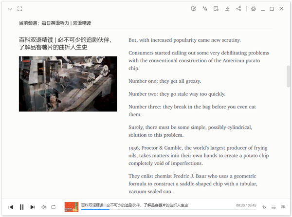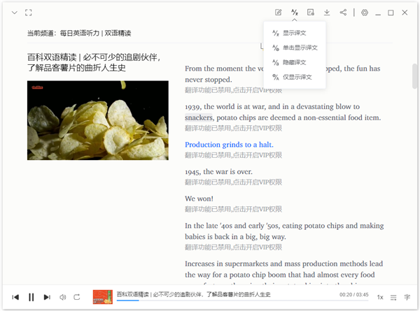 2、在专题页中,点击任意一篇听力内容,进入播放页面。