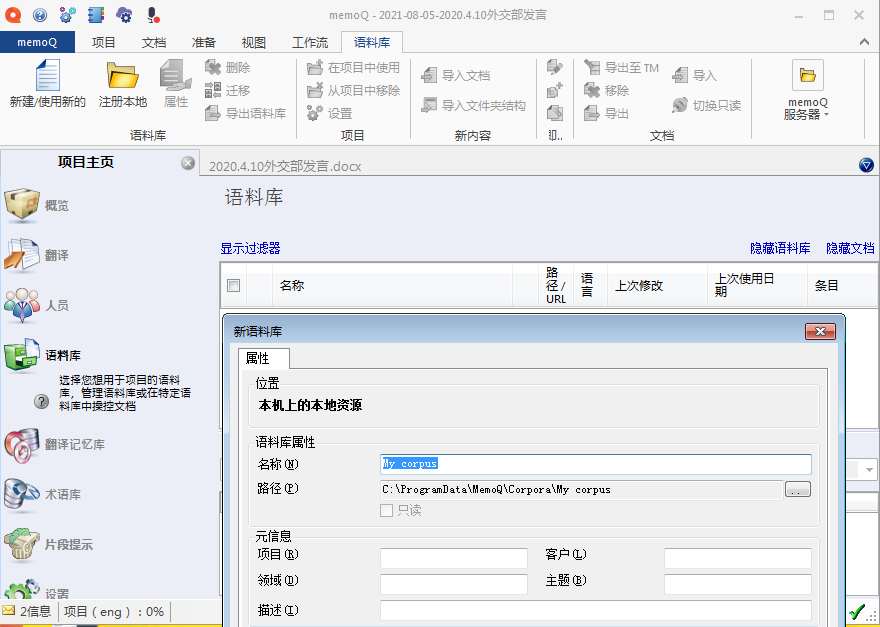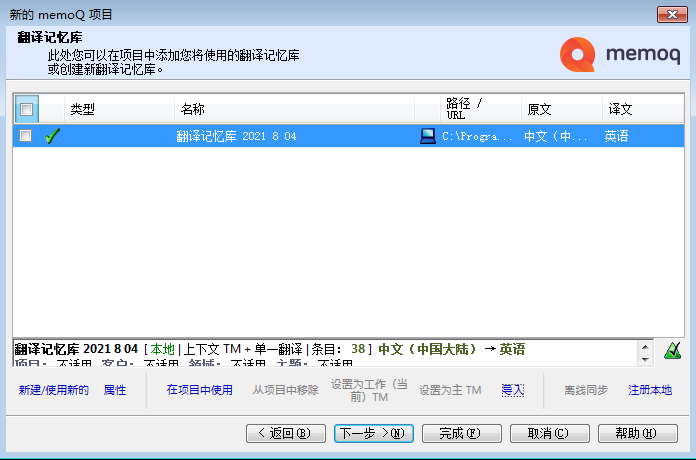 导入待翻译文档后,系统引导创建专属翻译记忆库:点击【新建/使用新的】,命名并指定语言对。若已有TMX格式记忆库,可直接导入;如无现成资源,建议通过tmxmall平台下载行业语料,或使用Aligner工具对齐双语句对生成高质量TMX文件。支持同时新建多个记忆库,并批量启用多个TMX/CSV文件以扩充语料覆盖范围。