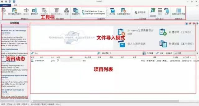 主界面清晰划分为工具栏、项目导航区、菜单栏与中央翻译工作区。工具栏集中提供项目新建、文档导入、设置调整等高频操作入口;项目列表支持多模式导入与官方资讯查看。