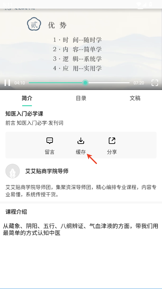 4、于视频播放界面下方点击【缓存】按钮,即可将课程下载至本地,随时随地无网学习。