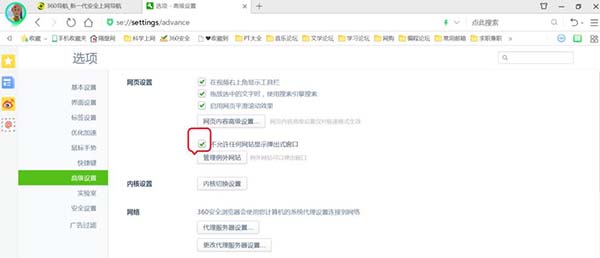 3、在“隐私设置”区域取消勾选“不允许任何网站显示弹出式窗口”,保存设置即可生效。