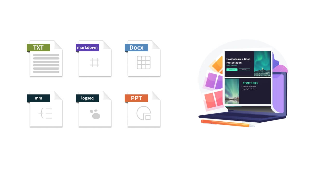 4、全格式文档智能解析导入:原生支持Markdown、Word(.docx)、TXT、PDF等主流文档格式,自动识别层级结构与关键信息,精准转化为逻辑清晰的幻灯片大纲。