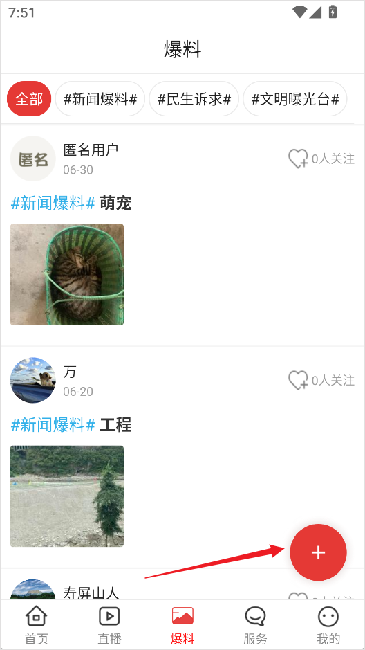 2、进入爆料页面后,点击右下角【+】按钮启动发布流程;