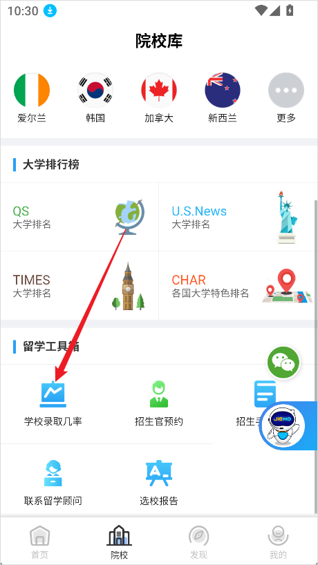 - 打开芥末留学App,在底部导航栏点击【院校】进入院校查询页面。
