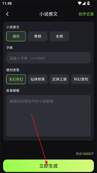 - 以“小说推文”为例,输入你的具体需求(如题材、情绪、关键词等),系统将立即生成高吸引力文案。