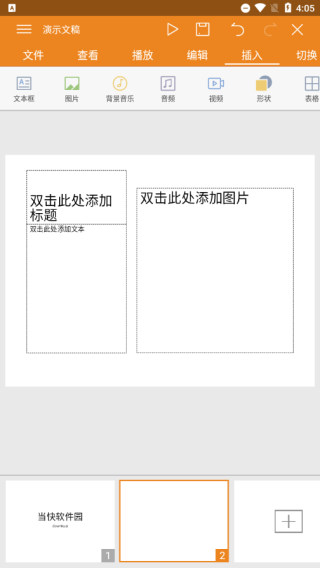 1、点击顶部菜单栏中的“编辑”或“插入”选项,可调整字体、字号、颜色,或插入形状、表格、音频等丰富元素,提升演示效果。
