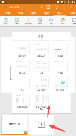 2、添加新幻灯片:点击底部幻灯片缩略图区域的“+”号按钮,从多种版式中选择适合的布局。
