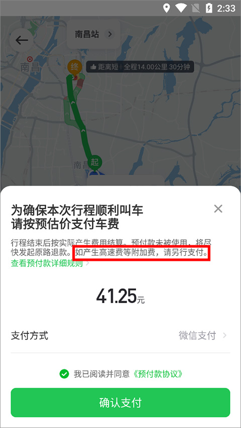 根据支付页面提示:“如产生高速费等附加费,请另行支付”,明确说明高速通行费由乘客承担。