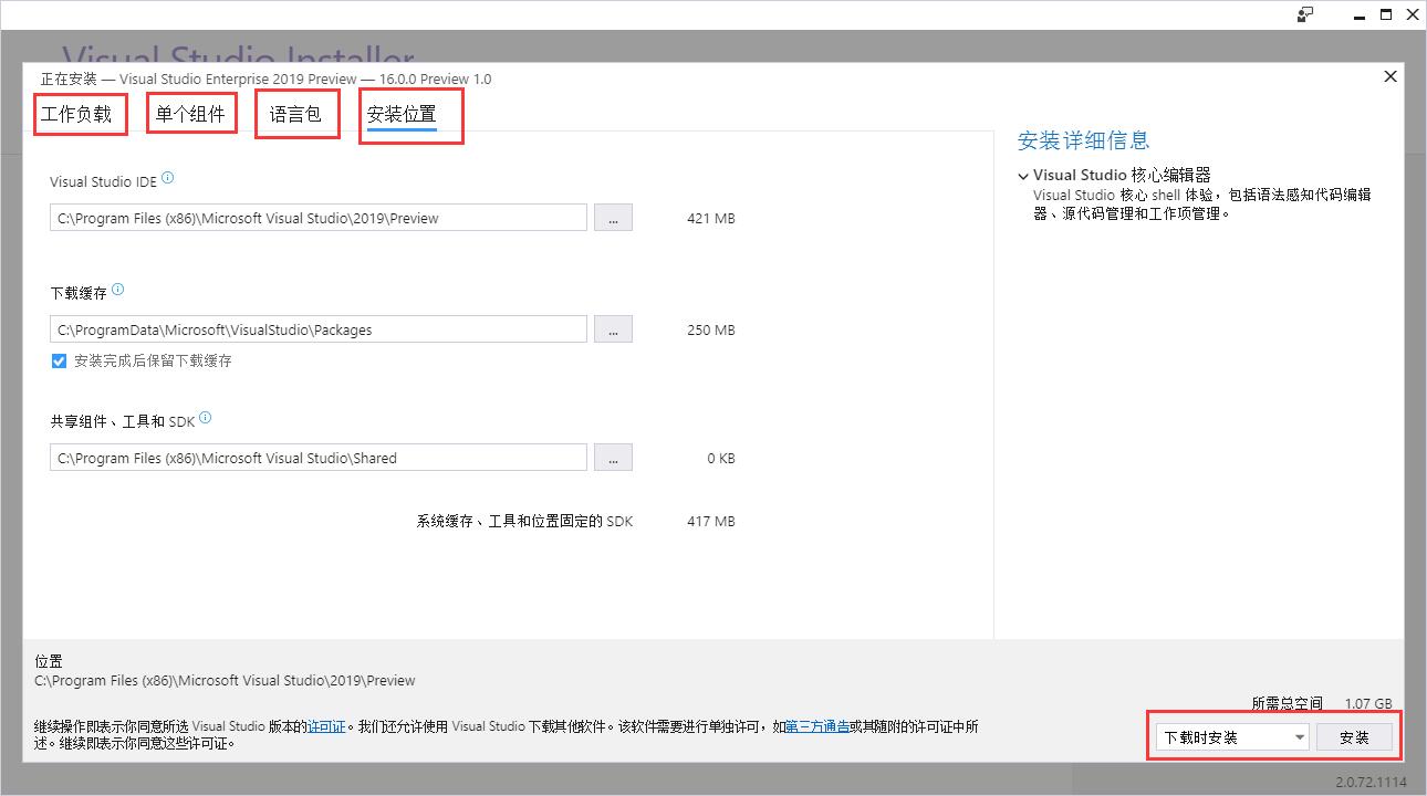 - 进入主安装界面,可根据需求在“工作负载”、“单个组件”、“语言包”和“安装位置”中进行自定义配置,完成后点击“安装”。