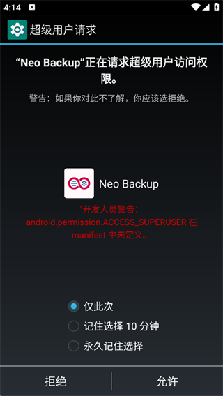1. 首次启动 Neo Backup 时,系统将请求 Root 权限。若设备已获取 Root,请点击“允许”以进入主界面。