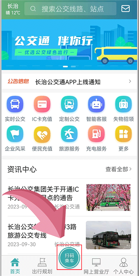 3、登录成功后,返回主页面,点击底部“扫码乘车”入口;